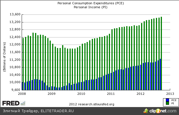Расходы потребителей выросли в ноябре на 0,4% или $41,3 млрд, против прогнозных 0,3%, тогда как доходы увеличились на 0,6% или $85,8 млрд. Реальные располагаемые доходы населения увеличились на 0,8% в ноябре, в отличие от снижения на 0,1% в октябре. Реальный PCE увеличился на 0,6%, в отличие от снижения на 0,2% месяцем ранее. Показатели восстановились после влияния последствий прошедшего урагана Сэнди.
