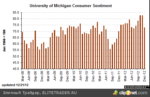 Опубликованным позитивным данным от Бюро экономического анализа по расходам/доходам потребителей и данным Census о заказах на товары длительного пользования не суждено было сколь либо изменить ход торгов, ввиду того, что статистика публиковалась еще до открытия, зато снижение до минимумов с июля индекса потребительского доверия, рассчитываемого Университетом Мичигана, было учтено инвесторами. Индикатор в декабре опустился с 82,7 до 72,9 пункта, против первой оценки в 74,5 пункта.