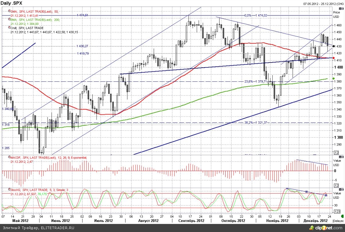 Пятничная экспирация фьючерсов и опционов, традиционно сопровождалась высокими объемами торгов (8,59 млрд. акций против среднегодового уровня 6,47 млрд.) притом, что ключевой посыл дальнейшему движению был обозначен еще в четверг после закрытия, когда Джон Бейнер, заявил, что не удалось провести запланированное голосование по так называемому «плану Б», предусматривающему повышение налогов только для миллионеров, и теперь Обаме придется работать с лидером демократов в Сенате - Ридом над законопроектом, способным предотвратить секвестр.