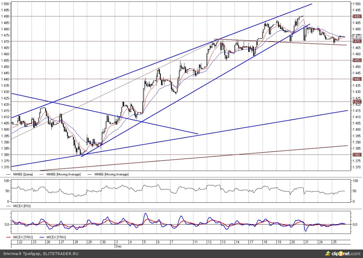 Не удивительно, что техническая картина в индексе ММВБ практически не изменилась. Мы все также консолидируемся под ключевой зоной сопротивления 1485-1500п. Ближайшая поддержка расположена в районе 1450п. Четких сигналов к активным действиям в рамках данного диапазона пока не поступает. В данный момент рекомендуется лишь переждать период пониженной волатильности и принимать инвестиционные решения уже после новогодних каникул.
