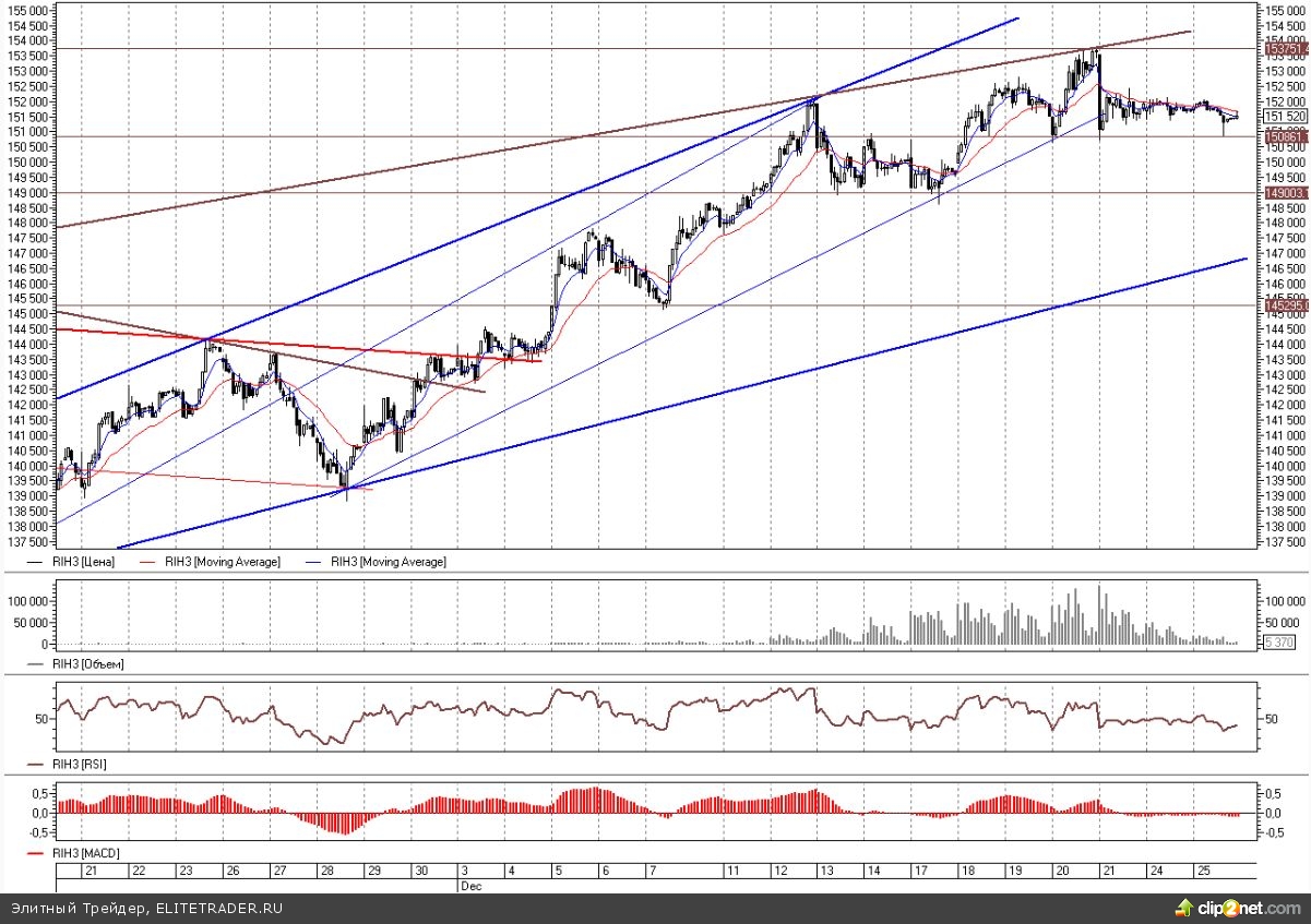В оставшиеся до конца года дни игроки еще будут пробовать подтянуть RIH3 вверх, возможно даже к текущим максимумам. Но больше вероятности за дальнейшую коррекцию, особенно на опасениях возможности «бюджетного обрыва» в США. При пробитии поддержек на 150800 следующие цели для фьючерса внизу близлежащие поддержки с минимумов середины декабря на 149000.