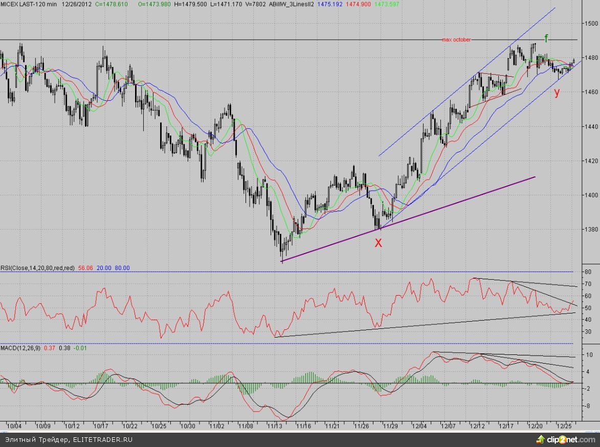 Таким образом, «быки» не стали уступать даже ближайшие рубежи. Правда, и «медведи» особо не усердствовали. Плюсом для покупателей является то, что дивергентный тренд по RSI пробит наверх, при этом кривые MACD находятся в положительной зоне и развернуты вверх. Так что подъём котировок имеет хорошие шансы на продолжение. В этом случае роль ближайшего сопротивления сыграет 2-часовой фрактал на покупку f (1482,3 п.), а далее – уровень октябрьского максимума и предыдущих локальных экстремумов (~1489 п.). В роли ближайшей поддержки выступит уже упомянутая нижняя граница краткосрочного растущего канала, а далее – минимум вторника, он же новый 2-часовой фрактал на продажу Y (1467,2 п.).