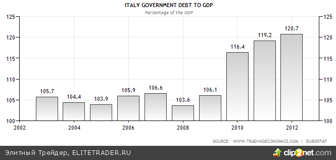 Италия также, следуя проверенному курсу Испании, начала проводить реформы, направленные на уменьшение дефицита бюджета страны и сокращение расходов. Величина госдолга страны, по прогнозам МВФ, к концу года составит 126%.