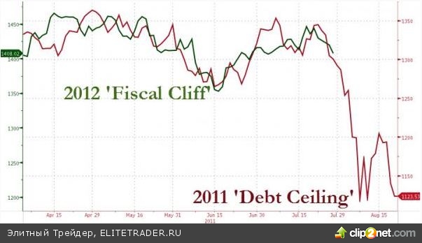 Третий аргумент. Американские инвесторы пока балансируют между верой и надеждой с одной стороны, и фантазиями на тему «не кинут же они нас так жестко?» – с другой. Но это не может продолжаться долго. Нерешительность политиков приведет к тому, что рынки, наконец, поймут, что от политиков ждать нечего. Тогда они дисциплинируют политиков в свойственной им, рынкам, манере. Так уже было перед обсуждением проблем лимита долга (смотрим на красную линию на следующем графике). Похоже, так же будет и сейчас (смотрим на зеленую линию на том же графике).