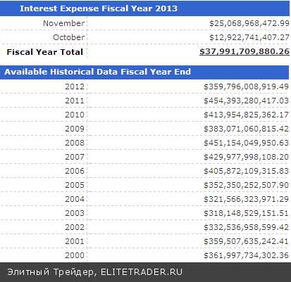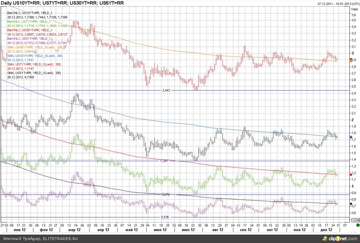 Глядя на динамику доходностей трежерис в 2012 году, становится очевидно, в особенности по показаниям скользящих средних, что в очередной год было сделано не мало для снижения давления обслуживания госдолга, как со стороны ФРС весь год выкупающей долгосрочные облигации в обмен на краткосрочные, так и со стороны европейских страхов.