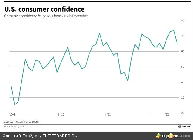 Подстегнули продажи и данные от Conference Board о снижении индекса потребительского доверия в декабре до 65,1 пункта с 71,5 пункта. Еще более существенное снижение показал индекс потребительских ожиданий, опустившись до 66,5 пункта с 80,9 пункта. По мнению директора исследовательского центра организации Линн Франко снижение вызвано неопределенностью в отношении фискального обрыва.