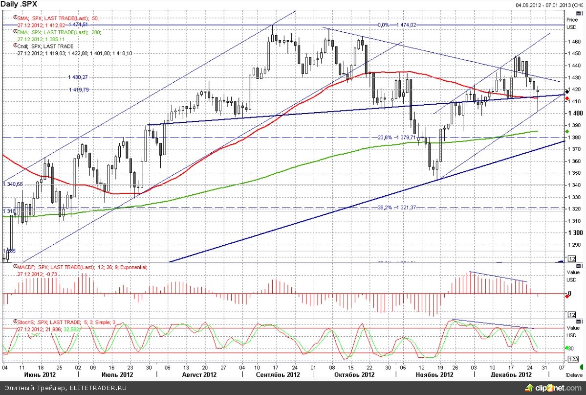 Впрочем, вчера она в некоторой степени пошатнулось. Судя по всем срокам, пора бы было говорить о конкретных решениях по достижению компромисса, но вместо этого лидер демократического большинства в Сенате Гарри Рид заявил, что бюджетный спор, вероятно, не будет решен до 1 января, потому что республиканцы не готовы сотрудничать. Эта новость едва не вывела индекс широкого рынка S&P500 к психологически важному рубежу на 1400 пунктов.