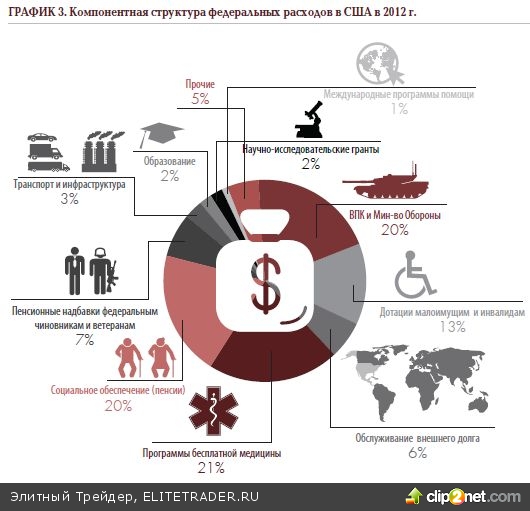 Федеральное правительство США в настоящее время тратит порядка 23% всего совокупного экономического продукта, в то время как собирает лишь 16% от его объёма в виде бюджетных доходов. Результирующая разница представляет собой дефицит федерального бюджета США, который в последние 4 года упорно приближается к отметке 1 трлн долларов