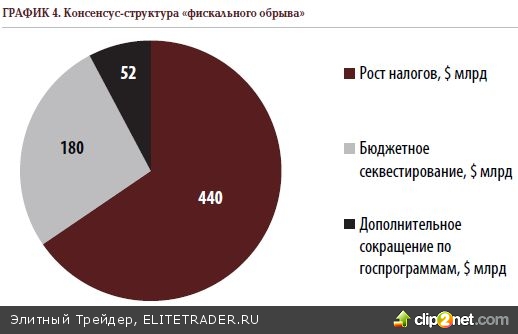 Как известно, если конгресс бездействует, то в январе произойдёт автосеквестирование, суть которого будет сводиться к вступлению в силу максимальной комбинации сокращения бюджетных расходов и увеличения налогов, которая по консенсус-оценкам приведёт к замедлению роста экономики США на 4 процентных пункта в течение первой половины 2013 года, что к концу этого периода обеспечивает с вероятностью 90% вхождение Америки в фазу рецессии.