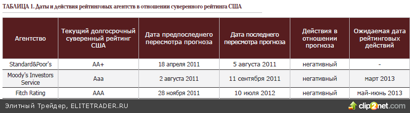 Больше всего нас тревожит позиция Moody’s, которые в 2012 году в течение короткого промежутка времени дважды (!) – см. Таблицу 1 – выпускали рейтинговые релизы, настойчиво предупреждавшие о высокой вероятности понижения суверенного кредитного долгосрочного рейтинга США на одну ступень в случае отсутствия понятного решения по сокращению бюджетного дефицита этой страны. Мы полагаем, что агентство всё же не будет «пороть горячку», учитывая потенциально огромный резонанс от подобного действия, и дождётся некоей стабилизации межпартийного диалога по данной теме, когда появится хотя бы минимальная ясность, в каком направлении развивается ситуация. В настоящее время такой ясности, несмотря на поджимающие сроки, нет и в помине.