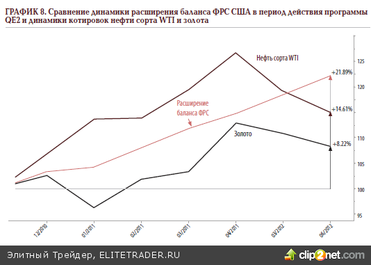 С точки зрения динамики роста твёрдых активов наиболее эффективной оказалась вторая программа, т.к. она прицельно «ударила» по доходности американских казначейских облигаций, сделав их, с одной стороны, менее затратными для обслуживания с точки зрения американского Минфина («фискальный обрыв»!), но в то же время – столь же менее привлекательными для многих инвесторов-нерезидентов, которые в поисках новой антиинфляционной защиты начали искать альтернативные объекты портфельных инвестиций, частично избавляясь от излишка долларов, тем самым, понижая курс американской валюты и, в противовес этому, невольно толкая вверх выраженную в тех же долларах биржевую стоимость практически всех твёрдых активов. Тем не менее, даже американские фонды в последнее время сильно «ностальгировали» по тем «счастливым временам», ибо американские фондовые индексы беспрестанно росли на протяжении почти целого года (возможно, этот рост был бы ещё более длительным, если бы не решение агентства Standard and Poor’s в начале августа 2011 года понизить суверенный рейтинг США на одну ступень, что вызвало панику на глобальных рынках) и позволили большинству фондов акций и смешанных фондов показать отличную доходность для своих клиентов, ради которой было даже не жаль принести в жертву курсовую стоимость доллара. На самом деле, в условиях замедляющейся экономики, роста просрочек по ипотеке и, как и прежде, «замороженного» кредитного рынка – и при отсутствии внешнего воздействия на рынки со стороны финансового регулятора, разумеется, ни о каких двузначных процентах доходности на инвестиции речи идти не могло бы!