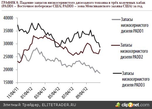 В начале ноября, следом за двумя разрушительными ураганами – Сэнди и Норсистер, – пронесшимися над Восточным побережьем США, мэр Нью-Йорка Майкл Блумберг установил рацион в потреблении бензина на местных АЗС в связи с образованием его резкого дефицита: автомобили с чётными цифрами на госномерах могли заправляться по чётным дням, а машины с нечётными цифрами на табличках, соответственно, по нечётным дням. Подобная беспрецедентная мера была принята вслед за аналогичным распоряжением губернатора штата Нью-Джерси Кристофера Кристи. Мы здесь приводим эту, в общем-то, «дней минувших» историю неспроста. Дело в том, что цены на нефть находились под серьёзным (и, по нашему мнению, искусственным) давлением, несмотря на ряд фундаментальных факторов, которые должны были в иной ситуации служить подспорьем их роста, в первую очередь, благодаря отчётам по коммерческим запасам от Минэнерго США. Согласно этим релизам в период между праймериз и президентской гонкой в Штатах запасы «чёрного золота» неожиданно выросли до исторических максимумов, в то время как резервы продуктов нефтепереработки – дистиллятов и бензина – наоборот, достигли абсолютных минимумов (см. Граф. 9):