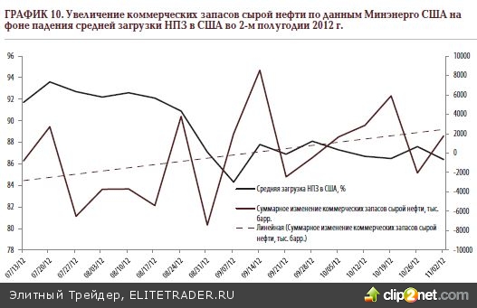 Таким образом, прогнозируя дальнейшую динамику цен на нефть в 2013 году, необходимо учитывать как внешние геополитические факторы (обострение военных конфликтов между Израилем и ХАМАС, гражданские войны и народные волнения в Сирии и Египте), так и действия ФРС (QE4, означающее расширение денежной массы и ослабление доллара), а также дальнейший план действий со стороны Минэнерго США в сложившейся экстремальной ситуации, который будет включать в себя значительное повышение загрузки американских НПЗ, а значит – и продолжение усредненного тренда на снижение коммерческих запасов сырой нефти (по крайней мере, в зимние месяцы).