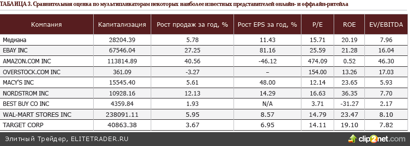Кто же основные фигуранты вышеуказанных тенденций? Потребители остаются весьма консервативными по своей сути, поэтому многочисленные новые онлайн-проекты далеко не всегда реализуются по намеченным планам (взять, к примеру, неудачи онлайн-купонного сервиса GroupOn, или снижение интереса потребителей к онлайн-кинотеатру Netflix ввиду частичного замещения аналогичного контента провайдерами высокоскоростного широкополосного интернета). Сами потребители говорят, что в их решении в пользу того или иного онлайн-шопа главными факторами остаются надёжность и высокая репутация, а также – простота осуществления покупок (в т.ч., и с помощью мобильных гаджетов). Более других в данном деле преуспели хорошо известные EBay (EBAY) и Amazon (AMZN). Продажи первого в вышеупомянутый «Киберпонедельник» подскочили на 55% год-к-году, а второго – на 42%, и это уже «не шутки». Даже признанный мировой гигант – сеть дискаунтеров WalMart – планирует еле- еле дотянуть объём параллельных онлайн-продаж в 2013 году до скромных 9 млрд долларов. «Онлайн-гранды» прочно держат этот рынок в своих руках и совершенно не намерены делиться своим «пирогом» с конкурентами «из реального мира».