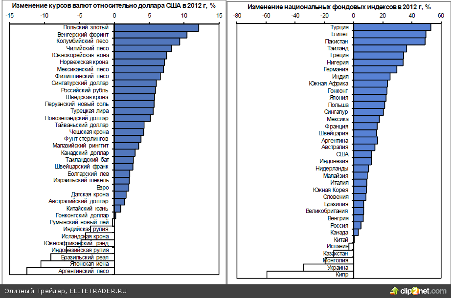 Завершающийся год оказался весьма непростым. Финансовые рынки продолжали трясти новости из Европы. Перспективы распада еврозоны инвесторы уже принимали как вполне рабочий сценарий, расходясь лишь в оценках вероятности такого развития событий. Это усилило спекулятивные атаки на рынки госдолга Италии и Испании, доходности 10-летних бумаг которых в середине года подошли к отметке 7% годовых. И только благодаря «плану Драги», объявлению о готовности ЕЦБ стать кредитором последней инстанции и выкупить на свой баланс гособлигации проблемных стран, удалось не только успокоить долговые рынки, но и возродить аппетит к риску у глобальных инвесторов. Практически одновременное с этим объявление третьего раунда количественного смягчения ФРС США обеспечило еще более динамичный подъём фондовых рынков. Центробанки сделали всё, что от них требовалось для нормализации ситуации на финансовых рынках. Правда им так и не удалось добиться уверенного восстановления экономики. И Федрезерв, и ЕЦБ указывают на неспособность обеспечить устойчивый рост лишь за счёт мер монетарной политики и ждут соответствующих шагов со стороны правительств. Однако правительства пока что сосредоточены на приведении в порядок госфинансов, заняты фискальной консолидацией, что сдерживает экономический рост. Сползание еврозоны в повторную рецессию – наглядное подтверждение последствий чрезмерного усердия в данном направлении. Если в течение года внимание инвесторов было приковано к способности стран европейской периферии выполнить взятые на себя обязательства по сокращению госрасходов, то теперь – к аналогичным проблемам бюджета и госдолга США