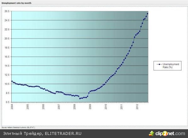Собственно, с фундаментальной точки зрения, ситуация в греческой экономике не улучшается, что отчетливо видно на графике безработицы, которая неумолимо растет, начиная со второй половины 2008 года: