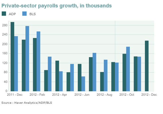 Шансы на более позитивные данные по занятости увеличились в четверг после выхода ADP, который обрабатывает тысячи зарплат компаний, и данные показали рост найма с февраля. ADP заявляют о прибавке 215 тыс. рабочих мест в частном секторе в декабре, что существенно выше прогнозных 149 тыс. Некоторые экономисты также ожидают улучшение в найме в строительном секторе после внезапного сокращения рабочих мест в ноябре. Восстановление после урагана Сэнди также, вероятно, обеспечит импульс роста.