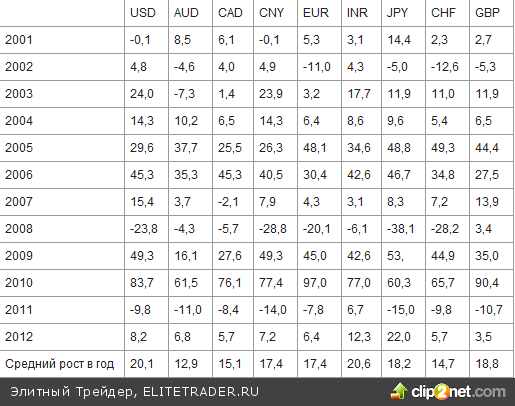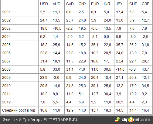 Золото также выросло в 2012 году против восьми основных мировых валют (см. таблицу).