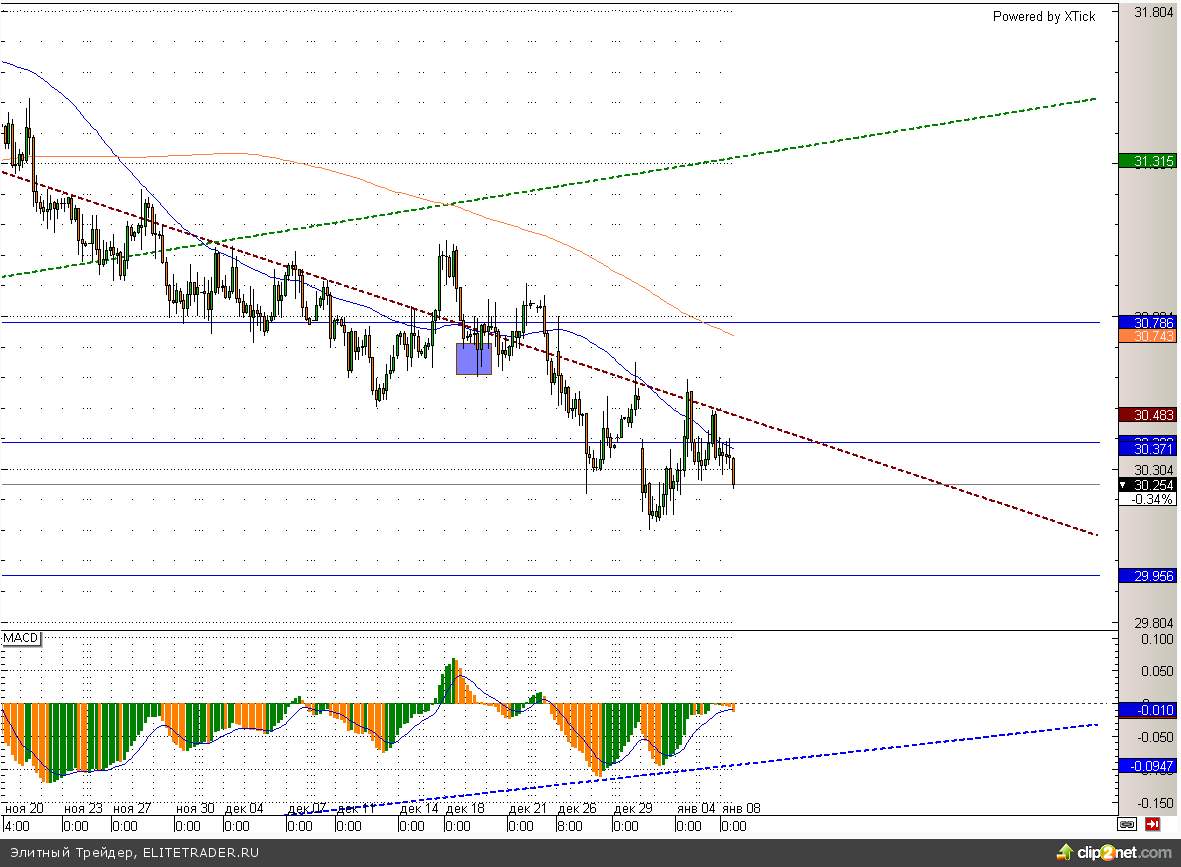 Рубль к доллару сегодня укрепляется на 10 копеек. Виной тому высокие цены на нефть и уход участников из доллара в более рисковые валюты, в связи с достигнутыми договоренностями по предотвращению «фискального обрыва» в США. Технически пара доллар рубль все еще в нисходящем тренде, что дает надежды на дальнейшее укрепление рубля. Между тем в данный момент идет образование модели «перевернутая голова и плечи». Реализация данной модели может привести к слому позитивного для рубля тренда и ослабить российскую валюту до уровня 30,75. Правда случится это лишь в случае закрепления пары выше отметки 30,6.