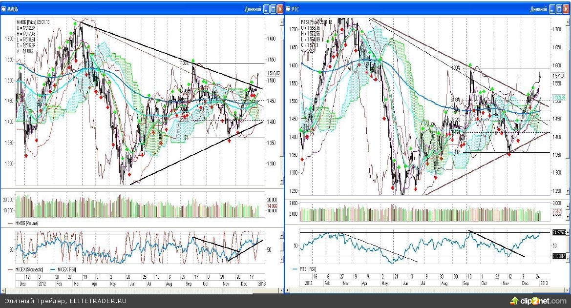 Возможно, еще не все биржевики вернулись с новогодних каникул, и потому на текущих уровнях индексы могут консолидироваться вплоть до следующей недели. Разрывы, оставленные в первый торговый день на уровнях 1480,37-1484,89 пунктов по индексу ММВБ и на 1526,48-1553,75 пунктов по индексу РТС пока закрываться не будут. Но если максимумы сентября 2012 года устоят, то не исключено, что наши рынки подвергнуться некоторой коррекции, целью которой будет возврат индексов в районы новогодних разрывов.