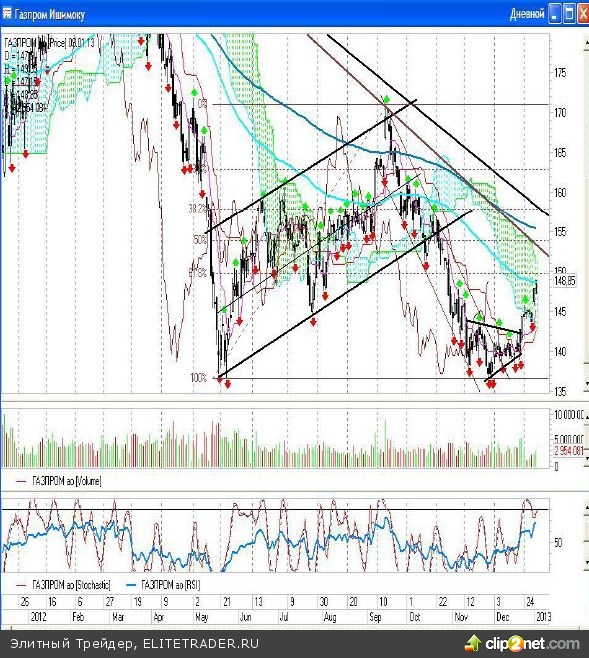 Напоминаю, что на уровне 5603-5665 рублей они оставили незакрытый «гэп», но учитывая, что вчера им удалось преодолеть максимум 20 декабря, вероятнее всего в ближайшее время мы увидим их в районе 5900-6000 рублей, где находится 100% уровень коррекции по Фибоначчи от снижения марта-ноября 2012 года и различные горизонтальные уровни сопротивления