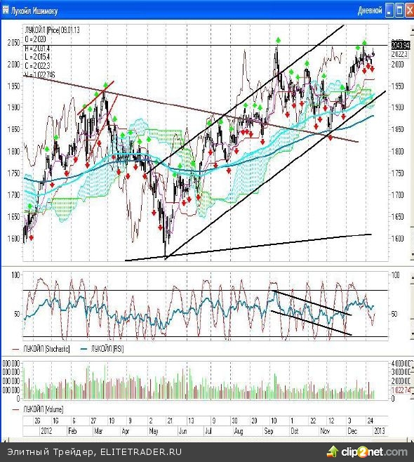 Как и прежде я советую дождаться либо пробоя данного сопротивления наверх, либо отката в зону 1930-1950 рублей к нижней границе текущего восходящего тренда, длящегося с мая-июня 2012 года, и только там подумывать об открытии «длинных» позиций с возможностью выставления короткого «стопа».