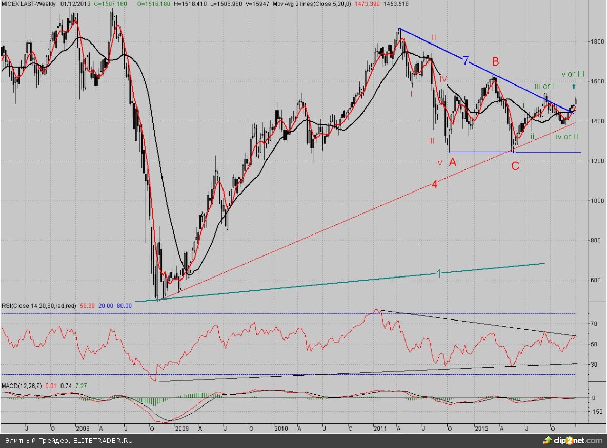 Большим плюсом для покупателей является то, что на недельном графике картина начала меняться кардинальным образом. Так, в середине декабря был преодолен долгосрочным падающий тренд (7). На этой неделе быстрая средняя скользящая МА(5) снизу вверх уверенно пересекла медленную МА(20) (золотой крест), и обе направлены вверх. А учитывая то, что наконец-то медленная кривая MACD вошла в положительную зону (чего не было с апреля прошлого года), то можно сказать, что практически созданы все предпосылки для продолжения среднесрочного роста. И ключевым условием для этого будет преодоление сентябрьского максимума (I) (1541,7 п.), который является и месячным фракталом на покупку. Волновую раскладку мы поменяли, и предполагаем, что волна «С» большого коррекционного движения «АВС» уже прошла (с марта по май) и была укороченной.