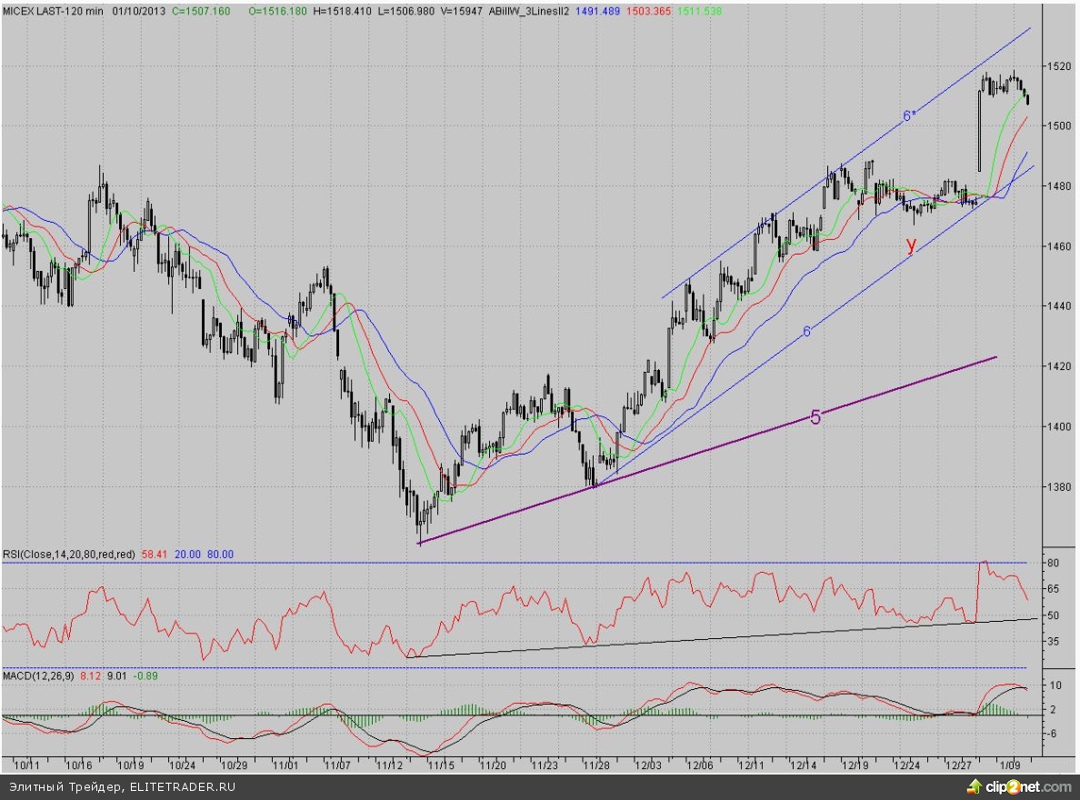Возвращаясь в настоящий день, напомним, что сегодня закрытие первой торговой недели года, и пока она завершается достаточно благоприятно для покупателей. Более того, у «быков» даже сохраняется пространство для манёвра в случае дальнейшего отступления. Так, ближайшей поддержкой теперь будет уровень 38%-ной коррекции от роста со вторника (~1500 п.), а далее – среднесрочный растущий тренд (6). Ключевым редутом «бычьей» обороны остаётся дневной фрактал на продажу Y (1467,2 п.).