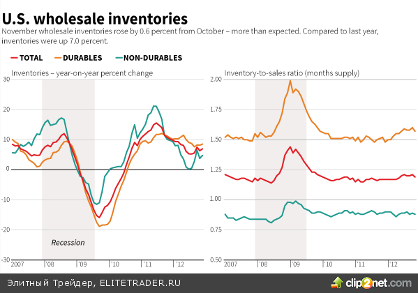 Собственная статистика также была в большей степени позитивной. Министерство торговли, а точнее его бюро сообщило о росте оптовых продаж на 2,3% в ноябре. Оптовые запасы увеличились на 0,6% до $498,95 млрд., тогда как аналитики ожидали роста на 0,3%. Запасоемкость - показатель, отражающий отношение величины запасов товарно-материальных ценностей к объему реализации продукции снизился с 1,21 до 1,19, указывая на рост спроса на продукцию.
