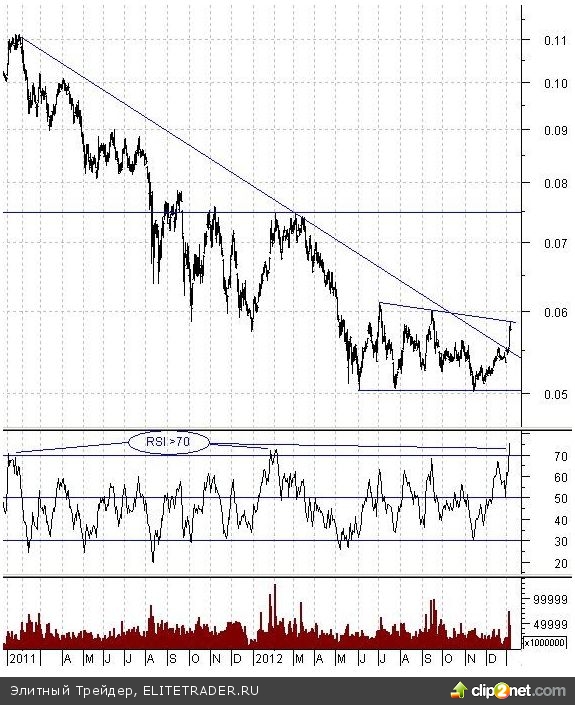 Вместе с тем на фоне ожиданий сильных финансовых отчетов от таких американских банков как Goldman Sach, JP Morgan, Citigroup, отчеты которых будут опубликованы в среду и в четверг, сохранился интерес инвесторов к акциям финансового сектора. Подъемом при резко выросших оборотах торгов здесь вновь выделились обыкновенные акции банка "Возрождение" (+7%), а также обыкновенные акции "Сбербанка", преодолевшие вчера психологический рубеж в 100 руб. В акциях ВТБ патологический подъем индикатора RSI (14) почему-то именно опять в январе в область перекупленности, находящейся выше его уровня в 70 пунктов, символизирует подход котировок к важной зоне сопротивления после оптимистичного прорыва многолетнего нисходящего тренда. Подъем акций ВТБ выше уровня в 6 коп. теоретически сулит продолжение роста в среднесрочной перспективе в район 7,0-7,5 коп. Однако судя по прошлым годам, пилообразный процесс консолидации в акциях ВТБ может затянуться, а перспективы преодоления ближайшей области сопротивления выглядят пока довольно призрачными.