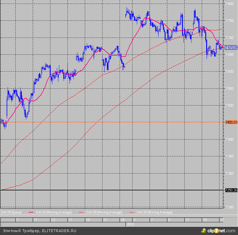 Немецкий индекс DAX упал с «гэпом» утром с 7690 до 7680 пунктов, а затем стал консолидироваться в диапазоне 7660-7670 пунктов, и вероятно, останется в этом коридоре до открытия рынков США.