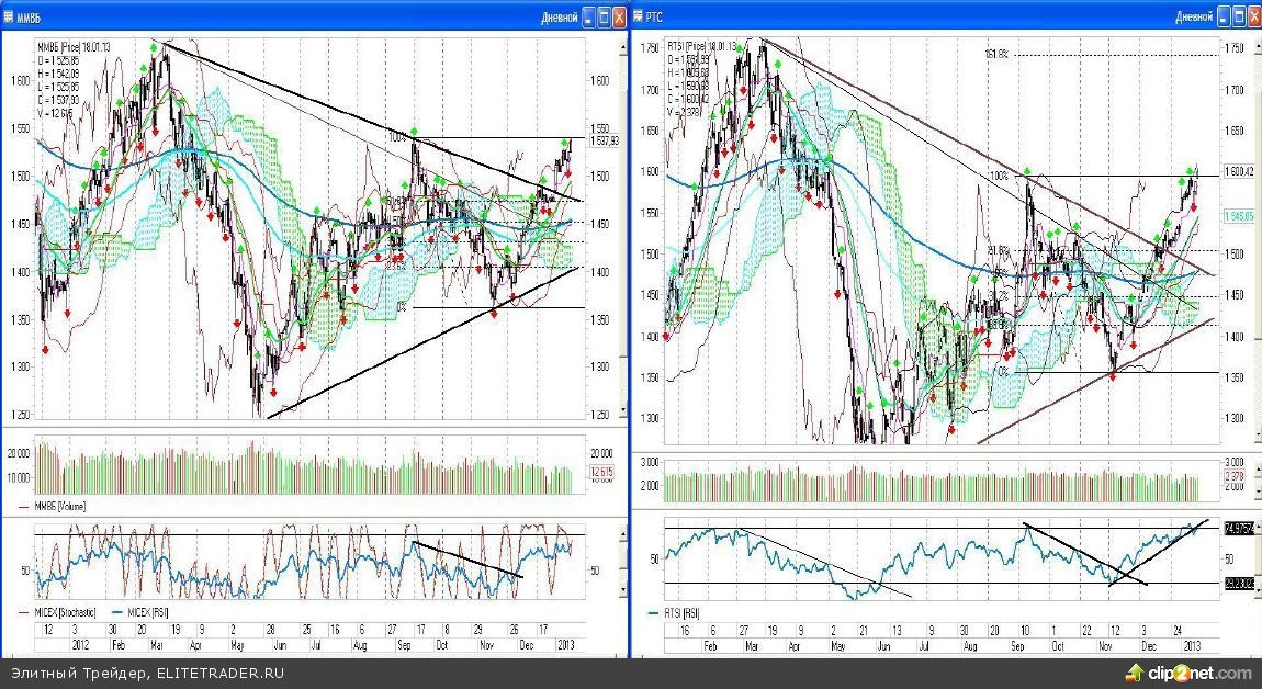 Самое главное, чтоб бросается в глаза – это тот факт, что индексу РТС удалось закрыть неделю выше предыдущего максимума, установленного в сентябре 2012 года. И хотя данный факт нуждается в подтверждении, например, закрытии еще 1-2 сессий выше уровня 1594,63 пунктов, уже сегодня игроки на повышение предпримут новые шаги к достижению новых вершин.