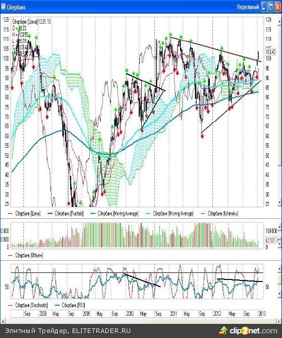 Глядя на его недельный график, очевидно, что акции выходят из образованного «треугольника» наверх. В пользу данного сценария говорят и нахождение недельной свечи за пределами верхней границы фигуры, рост торговых оборотов и пробой аналогичного сопротивления, нарисованного на осцилляторе RSI.