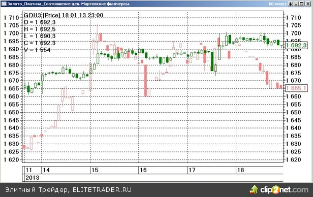 К середине прошлой недели стоимость фьючерса на платину впервые за долгое время превысила стоимость контракта на золото. Тем не менее, к завершению пятничных торгов разница цен в мартовских контрактах составила 27 долларов за унцию в пользу «желтого металла». Таким образом, текущий спрэд составляет около 1.6%.