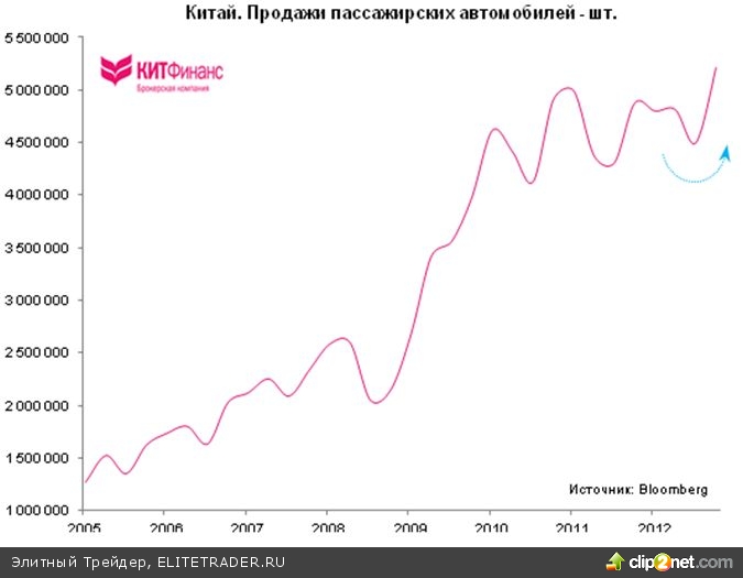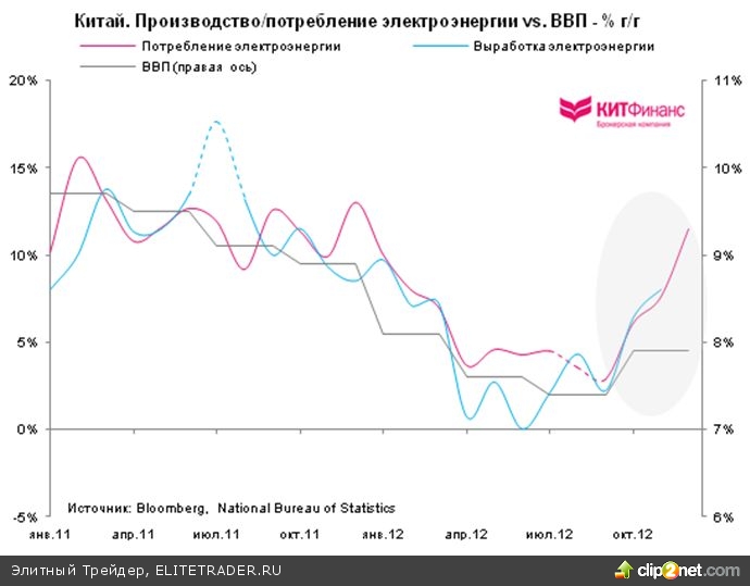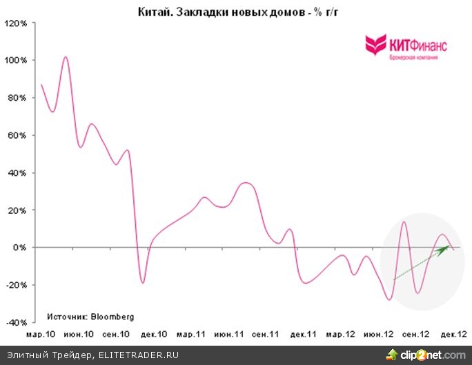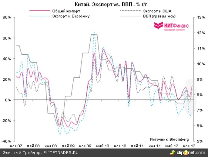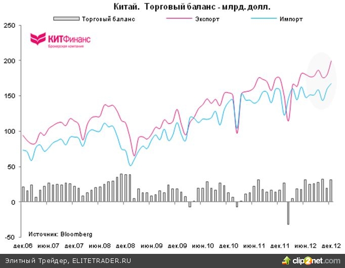 Рост экспорта в декабре на 14,1% в годовом выражении оказался, по данным Bloomberg, самым большим сюрпризом с марта 2011 г. Несмотря на расхождения этих данных с объемами движения товаров в портах, объему импорта торговых партнеров Китая и данных по экспортным заказам в индексе China PMI Manufacturing, столь высокие показатели свидетельствуют о постепенном восстановлении глобального спроса в четвертом квартале 2012 г