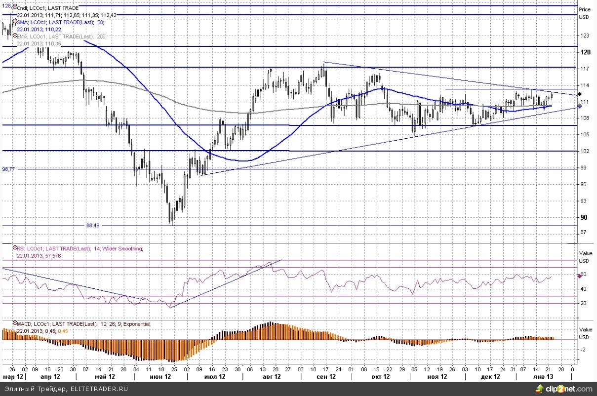 За счет вчерашнего роста котировки североморской Brent вплотную приблизились к верхней границе своего затянувшегося бокового коридора. Ключевое сопротивление проходит в зоне $112,5-113 за баррель. В случае пробоя и закрепления выше этих рубежей стоит рассчитывать на солидный восходящий импульс. Минимальной целью при таком варианте развития событий выступит отметка в $117.