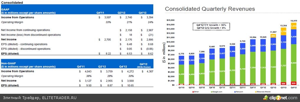 Google сообщила о росте на 36% по сравнению с четвертым кварталом 2011 года консолидированной выручки до $14,42 млрд. за квартал, закончившийся 31 декабря 2012 года. Консолидированная чистая прибыль составила $2,89 млрд., или $8,62 на акцию, по сравнению с $8,71 млрд., или $8,22 на акцию годом ранее. За исключением разовых факторов, прибыль выросла до $10,65 на акцию против прогнозных $10,5-10,54. Средняя цена за клик снизилась примерно на 6% по сравнению с четвертым кварталом 2011 года b увеличилась примерно на 2% по сравнению с третьим кварталом 2012 года.