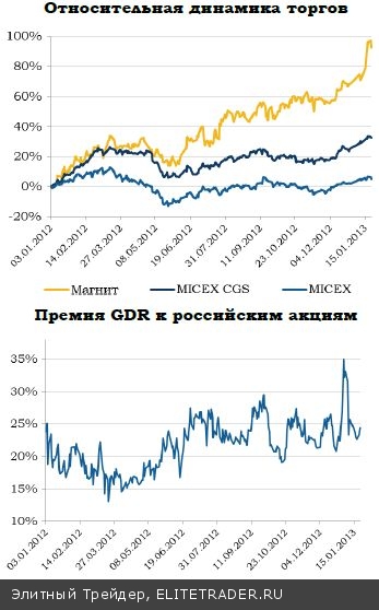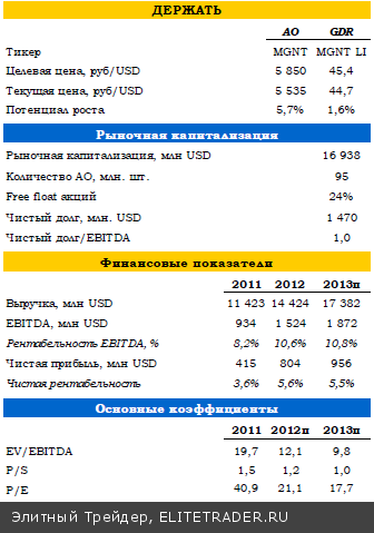 В конце 2012 года и начале 2013 бумаги Магнита демонстрировали бурный рост в ожидании сильных результатов по итогам года. Теперь компания эти результаты показала, и для многих инвесторов это может стать поводом для фиксации прибыли. Мы сохраняем позитивный взгляд на компанию, однако наша оценка справедливой стоимости Магнита на конец 2013 года составляет 5850 рублей за бумагу (+6% к текущим уровням). Мы не видим существенных поводов для роста в ближайшей перспективе, с учетом потенциала для дальнейшего роста, текущая рекомендация – ДЕРЖАТЬ. Мы считаем справедливой премию для GDR на уровне 20%. Справедливая стоимость депозитарных расписок, таким образом, – $45,4 за ГДР (1,6% к текущим уровням). Рекомендация по GDR – также ДЕРЖАТЬ.