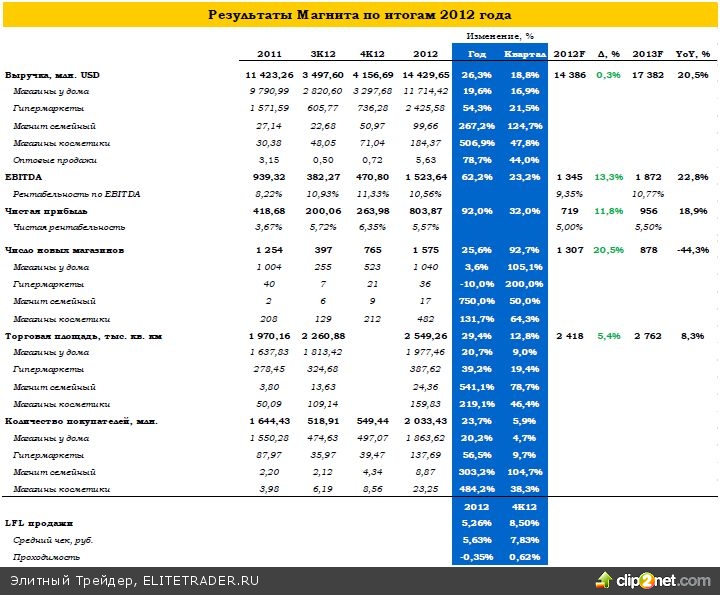 Мы оцениваем результаты как очень сильные, как в абсолютном выражении, так и на фоне конкурентов. Вместе с тем, мы опасаемся, что эти результаты зададут очень высокую планку на 2013 год. Мы ожидаем, что в этом году Магнит замедлит экспансию, и компании придется постараться, чтобы удержать внимание инвесторов.