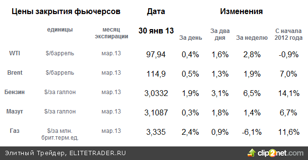 Цены на энергоносители 30 января подрастали с разной степенью интенсивности. Особенно старались цены на бензин. За неделю по бензину рост цен уже составил 6,5%. Рост цен происходил на фоне выхода данных Министерства энергетики США о запасах нефти и нефтепродуктов, согласно которым запасы бензинов снизились на 956 тыс. баррелей до 232,3 млн. баррелей. Стало известно, что коммерческие запасы нефти выросли почти на 6 млн. баррелей с 363,115 до 369,062 млн. баррелей. За счет сокращения запасов дистиллятов и бензинов общий рост коммерческих запасов нефти и нефтепродуктов был скромным - на уровне 1,97 млн. баррелей. (По итогам недели, завершившейся 25 января они составили 1103,217 млн. баррелей).