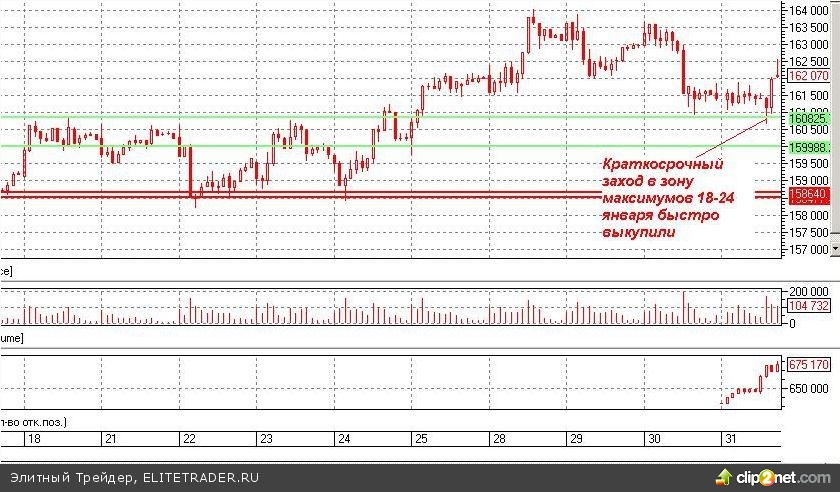 Во фьючерсе на индекс РТС весьма символично тестировали зону, которая представляла собой сопротивление с 18 по 25 января (обозначена зеленым цветом на рисунке 2). Заход в данную зону, резкий набор ОИ и быстрый выкуп. Весьма по-бычьи. С прицелом на дальние горизонты. Конечно, здесь также следует не исключать усложнения характера коррекции и новых попыток оттестировать данную зону.