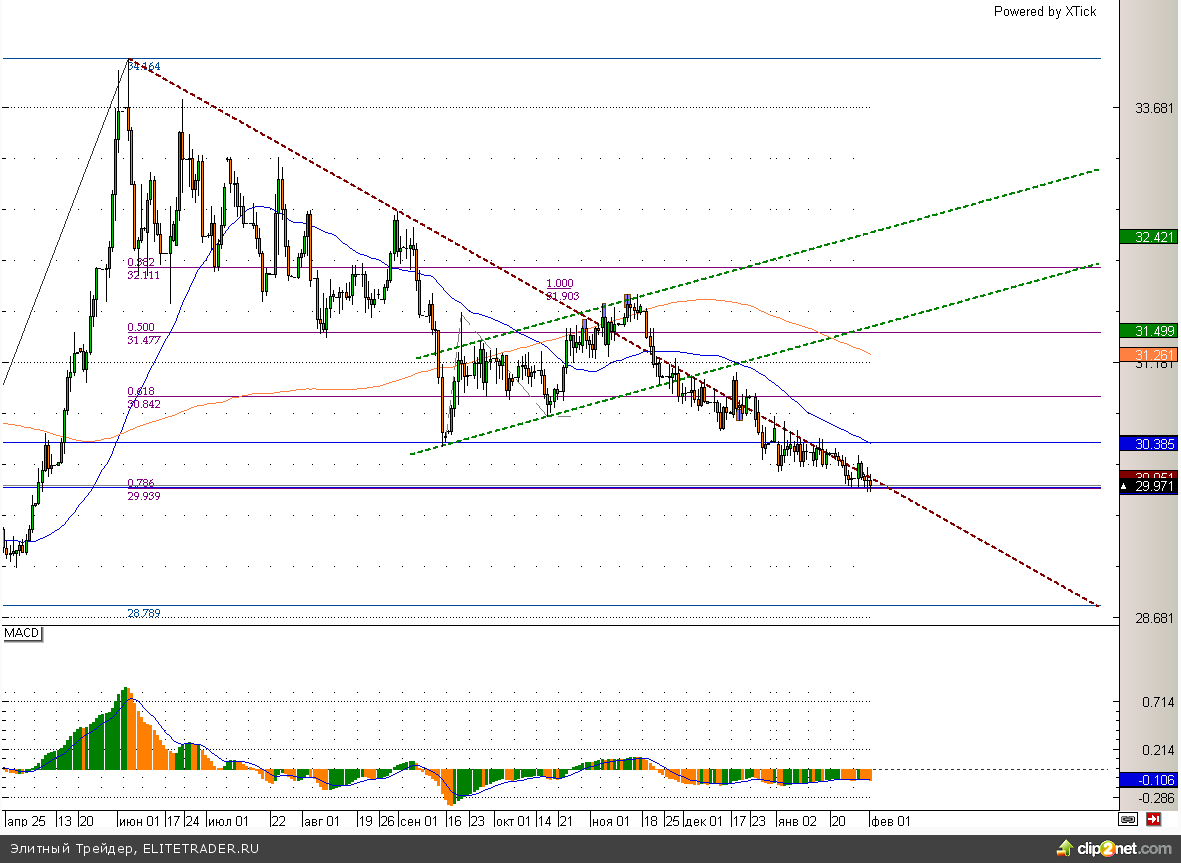 Отметка 29,95 так пока и не сдается, но благодаря очень высоким ценам на нефть данное сопротивление все же может быть сломлено и тогда пара пойдет в район 29,8.