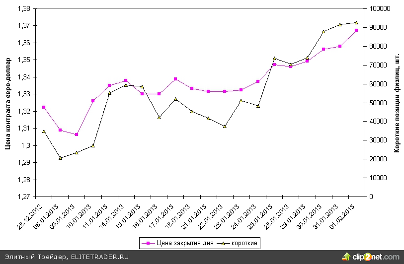 Рисунок 2. Короткие позиции физлиц во фьючерсе евро-доллар и динамика цены контракта