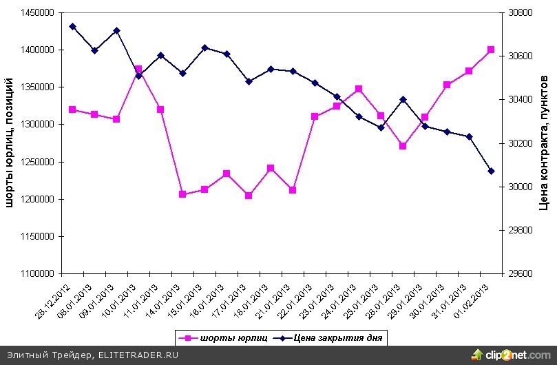 Рисунок 1. Короткие позиции юрлиц во фьючерсе рубль-доллар и динамика цены контракта