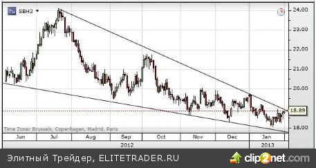 Цены на ключевые сельскохозяйственные культуры, такие как кукуруза и соевые бобы, в январе начали восстанавливаться после сильнейшей распродажи во второй половине 2012 года на фоне улучшения прогнозов предложения. Пока инвесторы ждут начала сезона посева в северном полушарии, они сконцентрировали свое внимание на погодных условиях в Южной Америке, где влажная погода в Бразилии помешала сбору урожая соевых бобов, а засушливая погода в Аргентине негативно повлияла на урожаи кукурузы и соевых бобов. Если засуха продолжится, то в ближайшие недели цены на эти две культуры могут вырасти еще больше, поскольку спекулянты продолжат наращивать чистые длинные позиции после значительной коррекции в последнем квартале 2012 года. На прошедшей неделе на рынке обеих культур были разрушены нисходящие тренды, построенные от максимальных значений, установленных в прошлом году, а это может означать дополнительный рост в ближайшем будущем. Мартовский контракт на соевые бобы может нацелиться на отметку 15 долларов за бушель, а мартовский контракт на кукурузу может попытать счастья на отметке 7,62 доллара за бушель.