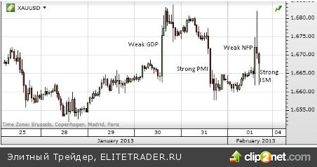 Из-за отсутствия уверенности инвесторы в золото в последнее время колеблются с плюса на минус в зависимости от характера экономических новостей, поступающих из США. Приведенный ниже график отчетливо показывает, что определяло погоду на рынке на прошедшей неделе, а также насколько отчаянно участники рынка пытались догадаться о том, в каком направлении думают сейчас члены ФРС США. Пока мы ждем убедительного толчка вверх (а именно это наш предпочтительный прогноз для золота), есть опасность, что оппортунистически настроенные продавцы могут, порой, перетягивать одеяло на свою сторону, что неизбежно приведет к очередной ликвидации длинных позиций.