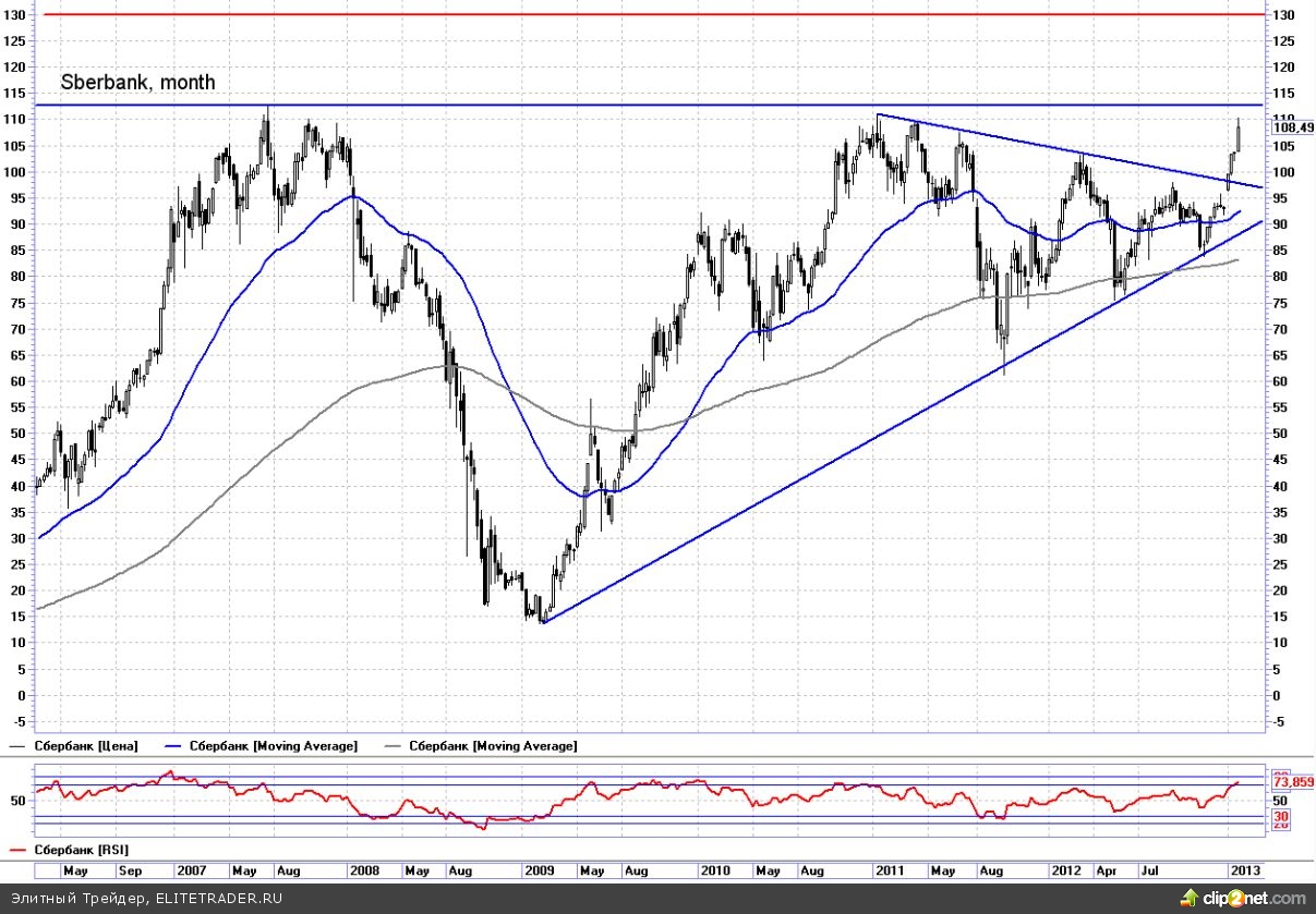 Ну а российский рынок на все это может ответить нашей главной фишкой - Сбербанком, который также находится в полушаге от своих максимальных значений за все время обращения бумаг. Несмотря на небольшую коррекцию в конце прошлой недели, в среднесрочной перспективе акции банка по-прежнему выглядят очень привлекательно. К тому же отметим и заявление руководства финансовой компании о том, что в этому году цена за одну акцию может подняться в район 130 руб.