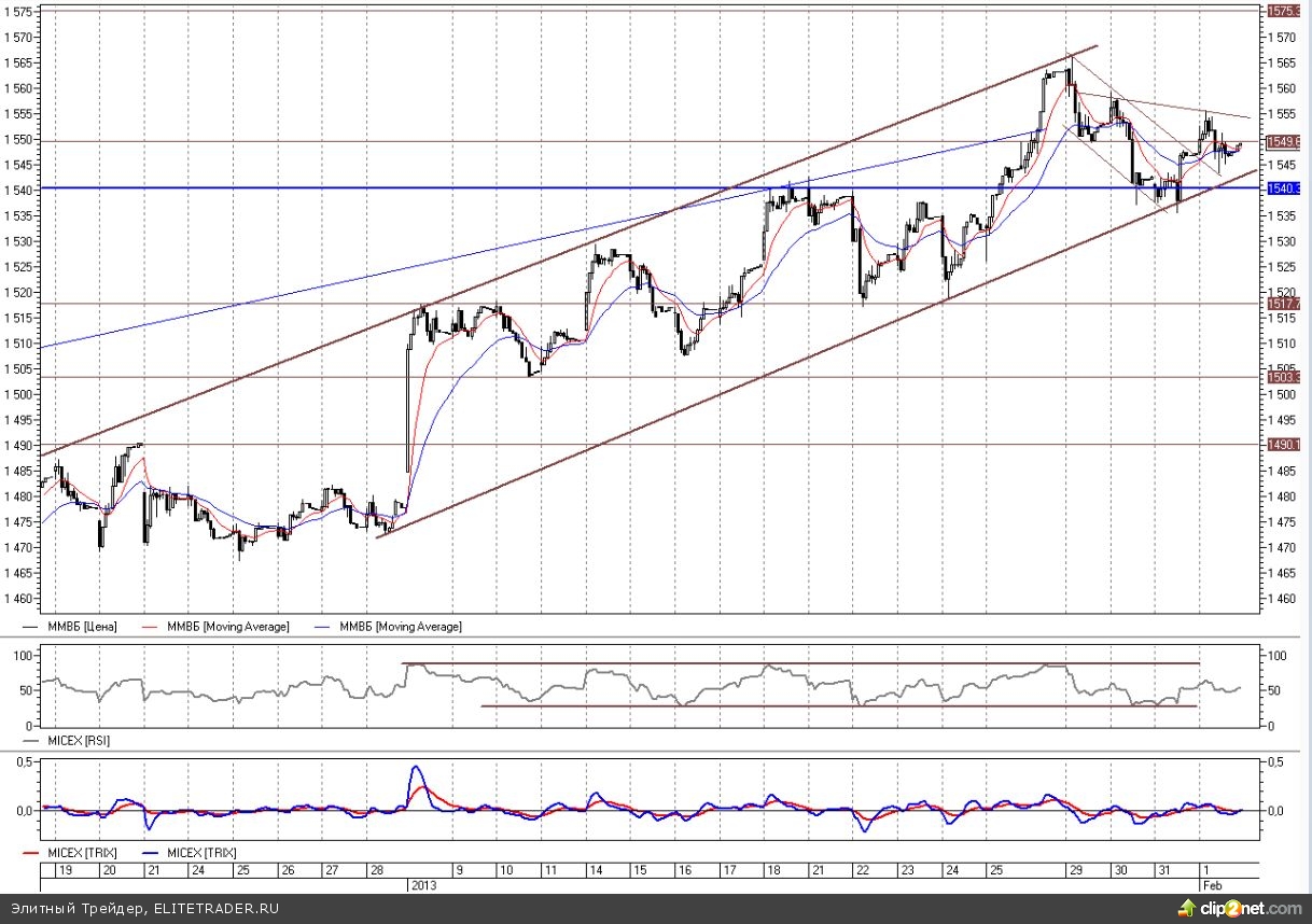 После небольшого снижения на прошлой неделе к восходящему тренду с начала года в район 1535 индекс ММВБ организовал отскок вверх и отыграл половину потерь от последней коррекции. В первый день февраля индикатор вернулся выше 1550 пунктов, но ненадолго.