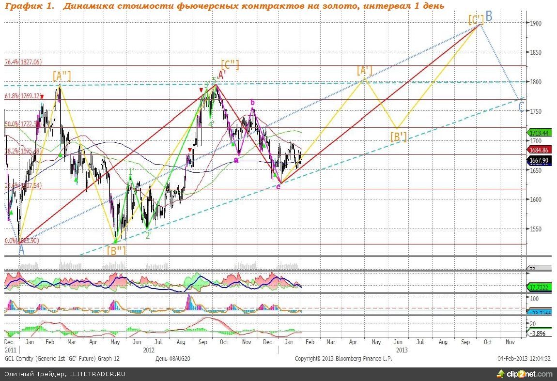 В начале сентября 2011 года цены на золото начали формировать масштабную плоскую коррекцию A-B-C. В настоящее время формируется восходящая волна B. В рамках указанной волны в начале января текущего года завершила развитие нисходящая волна B’ и стартовала развитие волна C’ ( [A’]-[B’]-[C’] ), направленная вверх.