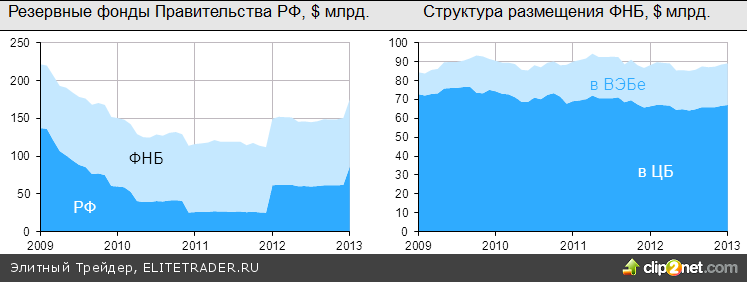 Фонд национального благосостояния на 1 февраля равнялся $ 89.2 млрд., а всего в обоих фондах было аккумулировано резервов на $ 175.4 млрд. При этом часть средств, находящихся в ФНБ, назвать резервами сложно - $ 22 млрд. размещены на долгосрочные депозиты в ВЭБе, который в свою очередь использует их как длинные кредитные ресурсы. Т.е. по сути эти деньги уже работают в экономике.